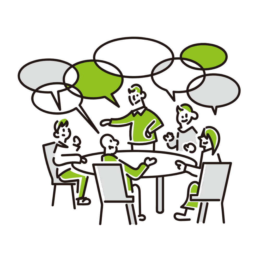 コミュニケーションスキルの向上を目指し、利用者さん同士でグループになって様々なテーマで意見を出し合うワークを行います。